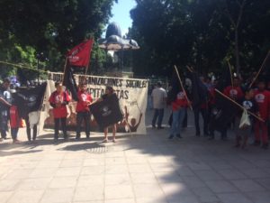 Beginning last night and early into the morning, today July 16th, 2018, the first Magonista women, men, boys, girls and youth began to arrive to accompany the press conference of the Bloc of Anti-Capitalist Social Organizations, of which we form a part. The press conference began at 11:00 am in the zócalo of the city of Oaxaca, in order for the honest Oaxacan people to know why, again, we have to leave our communities and walk through mountains and valleys to arrive to the residence of the government. This government, since 2010, has held our brother Pablo López Alavés, Indigenous Zapoteco forest defender, in their prison in Etla. The same government that tried to assassinate our brother Raúl Gatica forcing him into exile since 2005 in Canada. Since then we have been asking for guarantees for his safe return and the only response we have received is silence. Thus, we discussed amongst ourselves and decided to come down from the mountains, to plant ourselves in front of the government to see if they see us; to walk their main avenues to see if they hear us; to be present in their tourist spaces and the Guelaguetza made for the rich to remind them that not everyone in Oaxaca has dignified lives. Justice has not arrived to our communities. There are families that don’t have houses, and our lives are daily more precarious, while at the same time we have to work more and more.