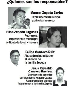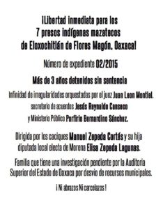 Eloxochitlán de Flores Magón is a municipality located in the Sierra Mazateca in the state of Oaxaca. The majority of the inhabitants speak Mazateco and the municipality is registered beneath the Internal Normative System, or Uses and Customs of Indigenous communities. However, since 2010, political parties have sought to interfere in the community life employing different strategies. One approach has been to cover up for the Zepeda Lagunas cacique family, who since 2010, has maintained control of the municipality. Eight years have already gone by with this family imposing its power through repression, persecution and incarceration, fabricating crimes against people that have organized to denounce the abuses and contracting armed men of the State of Mexico and surrounding municipalities. They have taken the municipality by force, imposing themselves as municipal authorities, without respecting the decisions of the community assembly as the maximum organ of decision-making in the community. They have enriched themselves by exploiting the natural resources of Eloxochitlán, such as rock, gravel and sand. This material has been sold by their own business to fulfill the necessities of supposed public works projects of the municipality. They have been accused of torture, damages, dispossession of land, ambushes against people in the community, including injuring a journalist. Yet, in spite of previous inquiries and judicial processes, not one member of this family has been arraigned for these acts. Rather, what has happened, is that their power continues to grow in Eloxochitlán de Flores Magón. Total impunity and corruption exist, sustained by the support this family receives from diverse state institutions, political parties, supposed human rights organizations and media outlets. The most recent example, was this year’s election, where the political party MORENA, allowed Elisa Zepeda Lagunas to run as one of their candidates for local representative. Elisa is a member of this cacique family and someone who has publicly portrayed herself as a defender of human rights. With this, she imposed herself as municipal president in Eloxochitlán, again violating the forms of internal elections in the Indigenous community. Months afterwards, she left this position, buying her candidacy for local representative for more than 5 million pesos. All the while, her father, Manuel Zepeda Lagunas, has been cited by the state audit office of Oaxaca for running up public expense sums for the fiscal year of 2013 that reached 21,000,000 pesos. As such, today we are here, to denounce that MORENA, accommodates these types of people, permitting aggressions, impunity and corruption to continue in the Mazateca community of Eloxochitlán. We are here, to demand the freedom of the seven prisoners of Eloxochitlán de Flores Magón, accused in December of 2014, by the Zepeda Lagunas family. Thanks to their political and economic power, they have manipulated the judicial process in the Mixed District Court of Huautla de Jiménez, with the case number 02/2015, slowing down the “due process” and causing the forced displacement of more than 20 families of the community. This cacique family, has converted the struggle to maintain the internal forms of organization of the community and the respect for community self-determination, into a judicial conflict and a case of ongoing persecution. In the Mazateca community of Eloxochitlán de Flores Magón, there is no tranquility with “peace”, but rather the imposition of repression, abuse of power and harassment beneath the command of the Zepeda family.