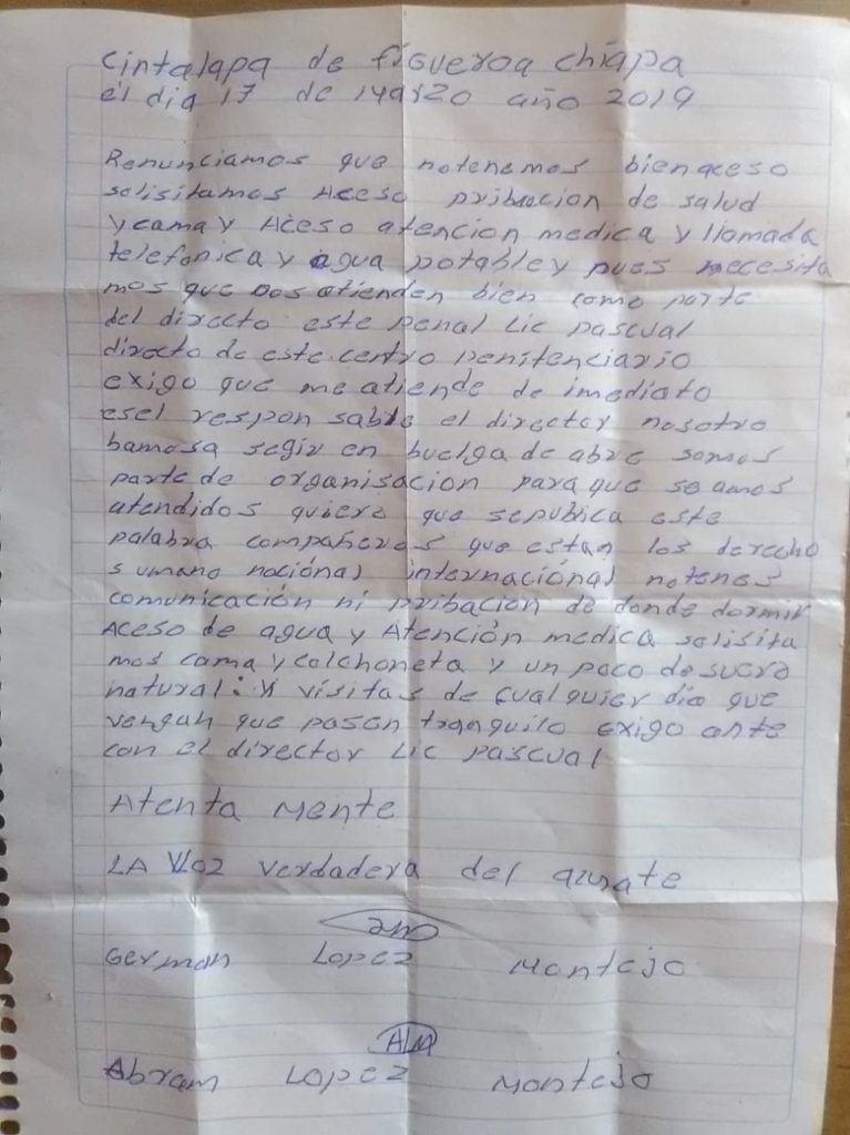 These two statements comes Indigenous prisoners in struggle, Germán López Montejo and Abraham López Montejo, who began a hunger strike on March 15th, 2019. Germán and Abraham are both part of the imprisoned organizing group, La Voz Verdadera del Amate. The original in Spanish was published by the working group, No Estamos Todxs, and can be found here.