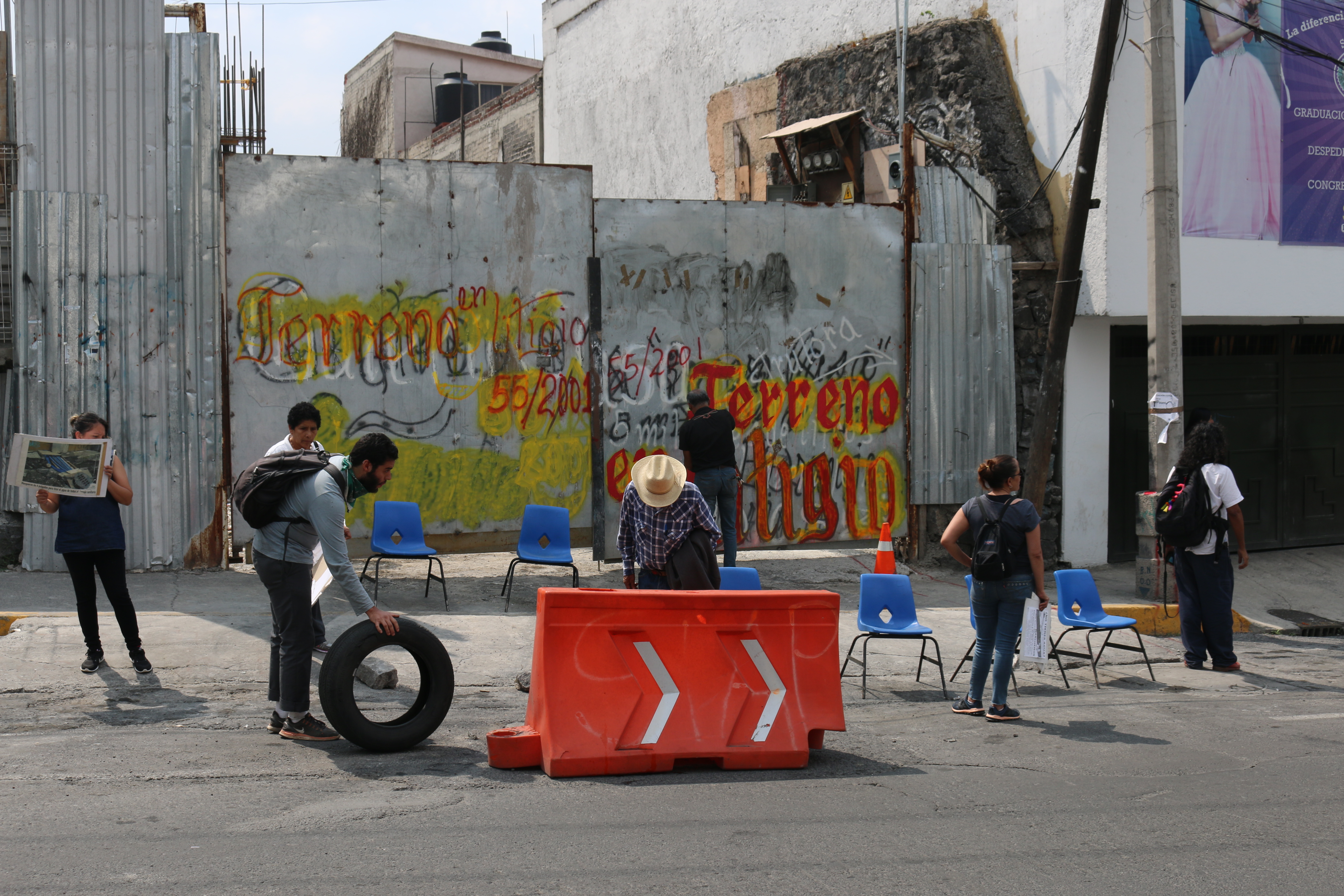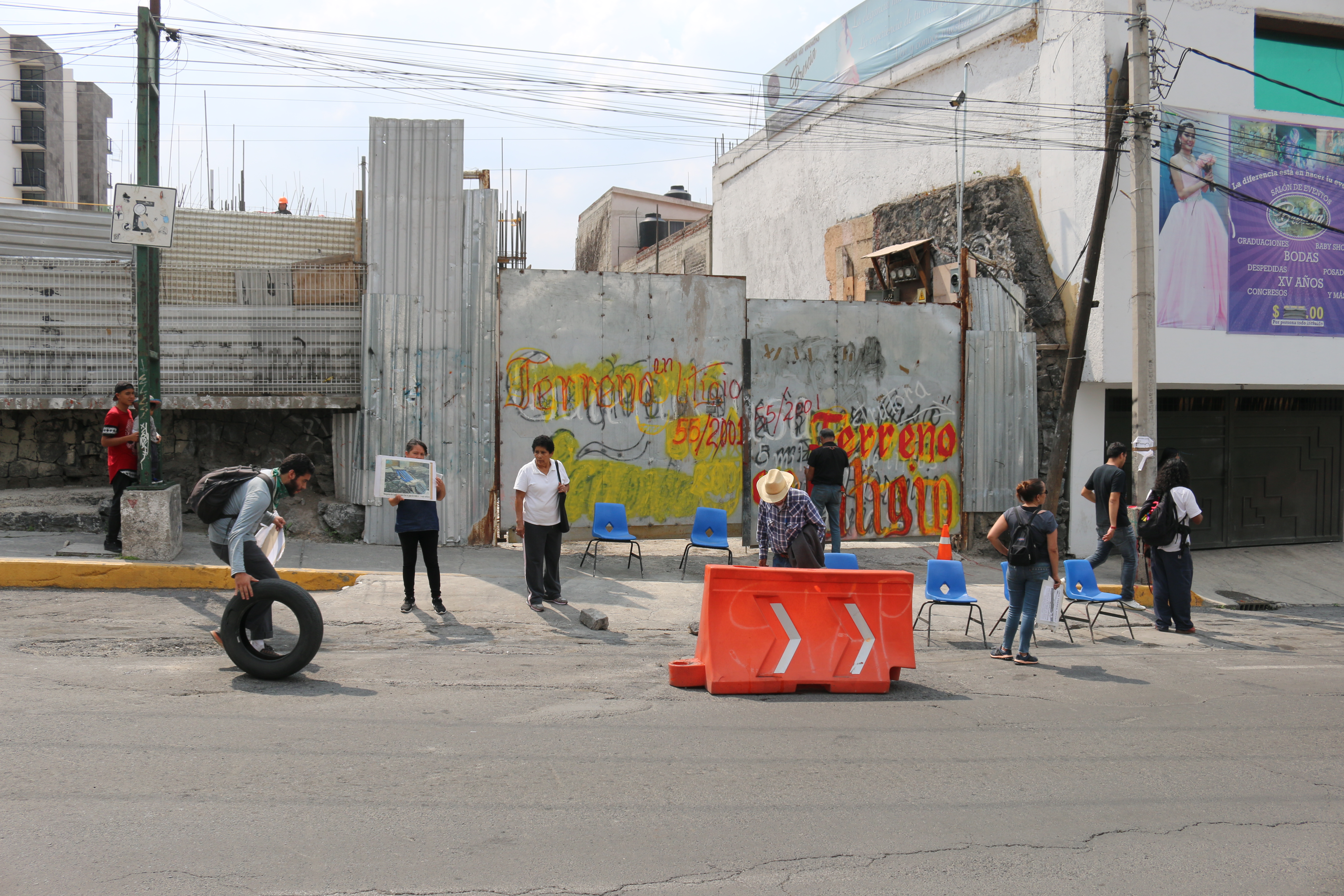 Today, August 8th, 2018, on the birthday of Mexican revolutionary General Emiliano Zapata, members of the General Assembly of Peoples, Neighborhoods, Communities and Pedregales of Coyoacan blockaded the two entrances to the real estate development project at Aztecas 215 in the south of Mexico City. For around three hours in the afternoon, the entrances were barricaded off, disallowing the movement of traffic and construction materials in and out of the construction site. At least three trucks full of construction material arrived, but were not permitted to enter. Waiting around a couple hours, the trucks eventually left without delivering the material to the construction site.