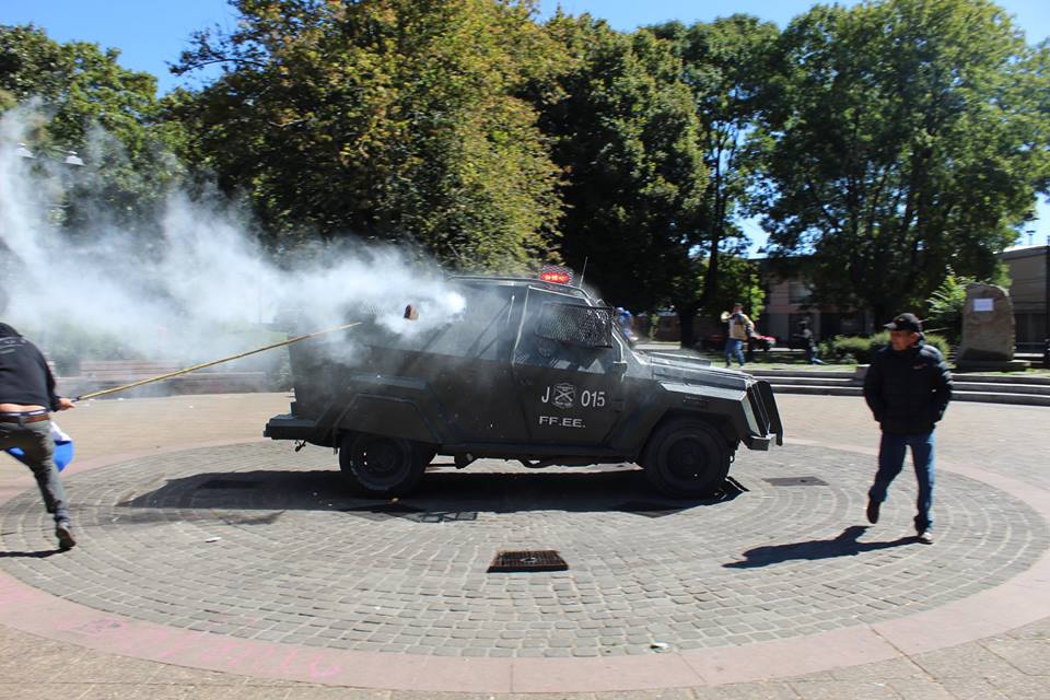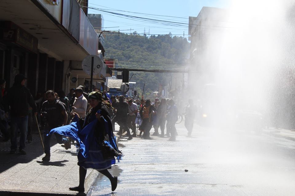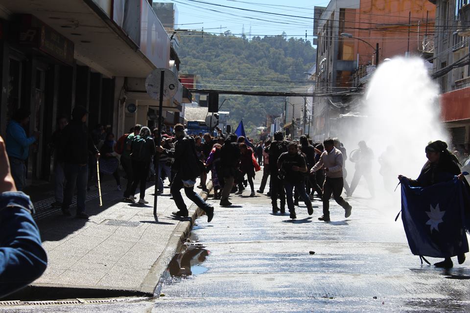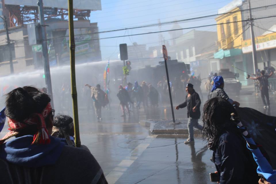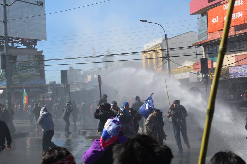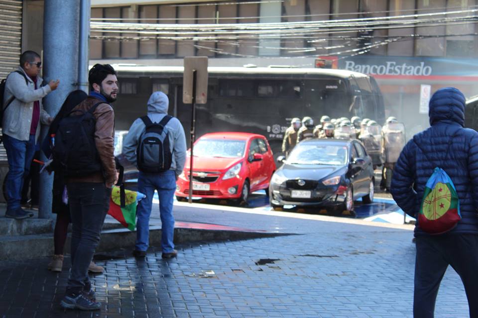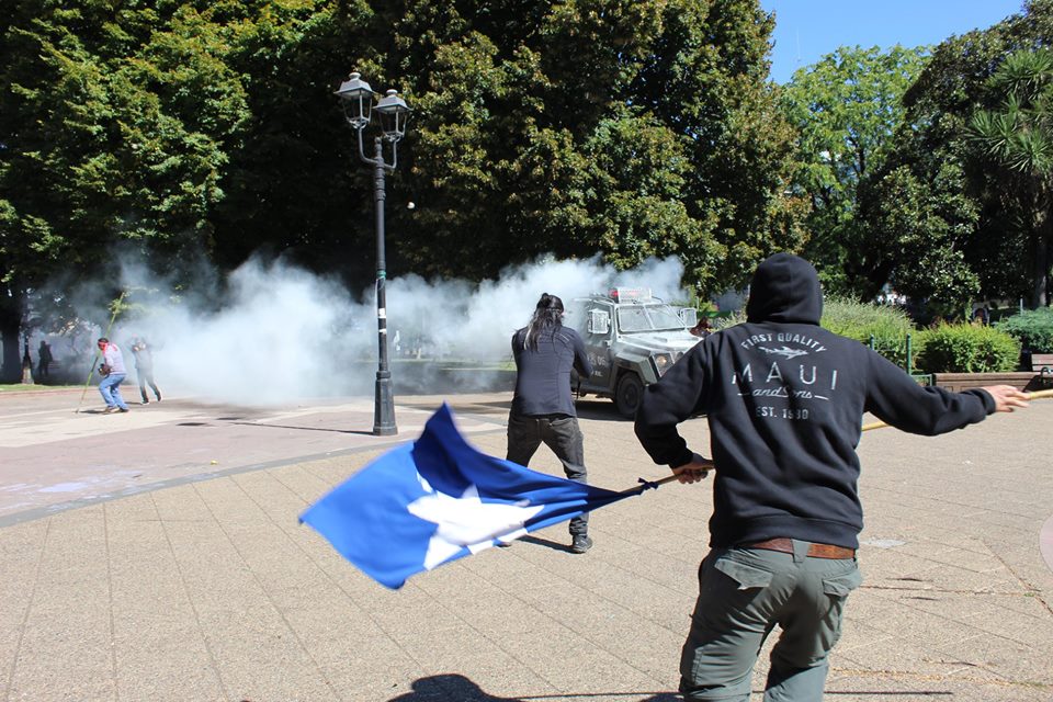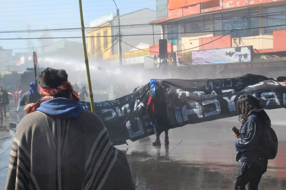 It was impossible to carry out the march today due to the unnecessary, racist and sophisticated police violence in the style of the School of Americas. The police carried out excessive and senseless operations against community members participating in the march. The repression resulted in arbitrary detentions against innocent people who were not even participants in the march. For example, there were Mapuche community members who were inside private vehicles who were detained. This was the case of Javier Llanca, who was violently detained from inside the private vehicle of the Werken of the autonomous community of Temucuicui, Jorge Huenchullan Cayul.