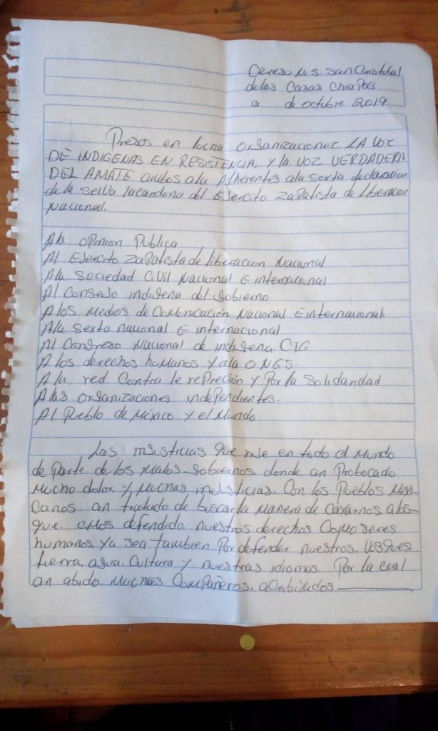As the organizations La Voz de Indigenas en Resistancia and La Voz Verdadera del Amate, we express our solidarity with Miguel, joining in the demand for his freedom. There are many inconsistencies in our legal cases. Only through struggle can true change and the unity of the compañeros be achieved. We will not be defeated easily. Only the construction of an Indigenous Governing Council in Mexico, whether it be campesino or worker, will quickly end the injustices of the bad governments that today we are suffering. “Enough with so many injustices!!” We will continue struggling and resisting until we achieve real justice.