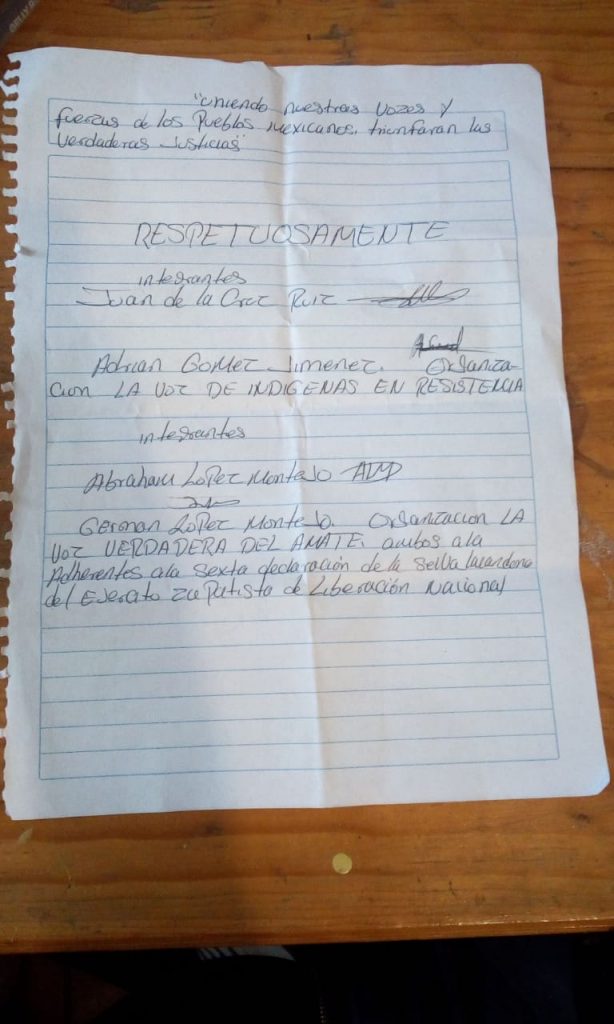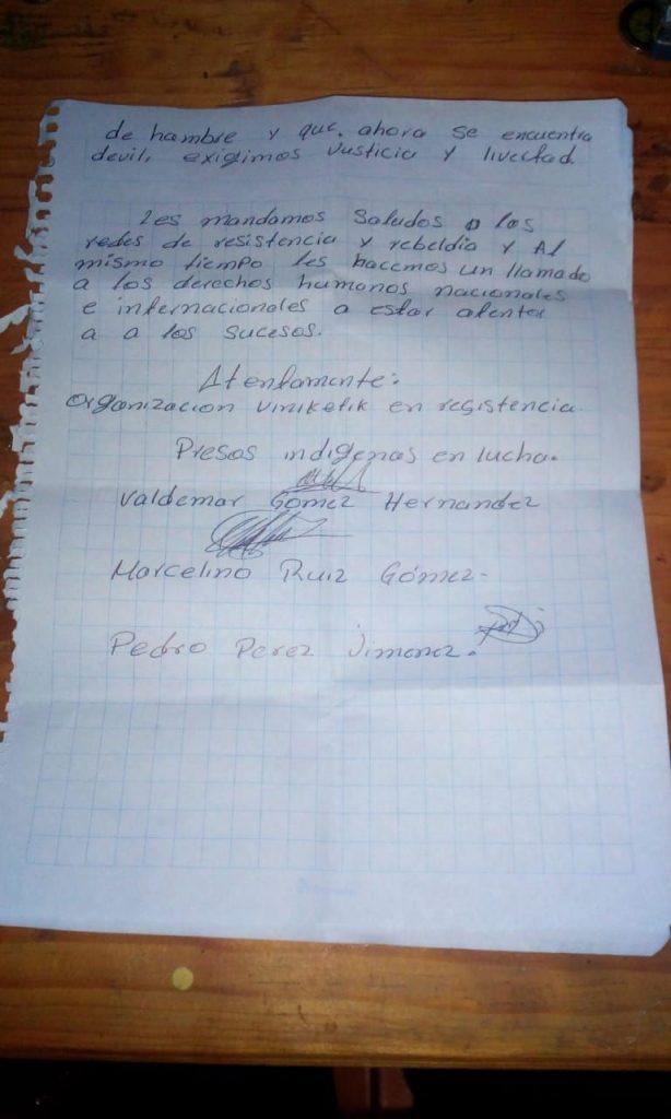 As the organizations La Voz de Indigenas en Resistancia and La Voz Verdadera del Amate, we express our solidarity with Miguel, joining in the demand for his freedom. There are many inconsistencies in our legal cases. Only through struggle can true change and the unity of the compañeros be achieved. We will not be defeated easily. Only the construction of an Indigenous Governing Council in Mexico, whether it be campesino or worker, will quickly end the injustices of the bad governments that today we are suffering. “Enough with so many injustices!!” We will continue struggling and resisting until we achieve real justice.