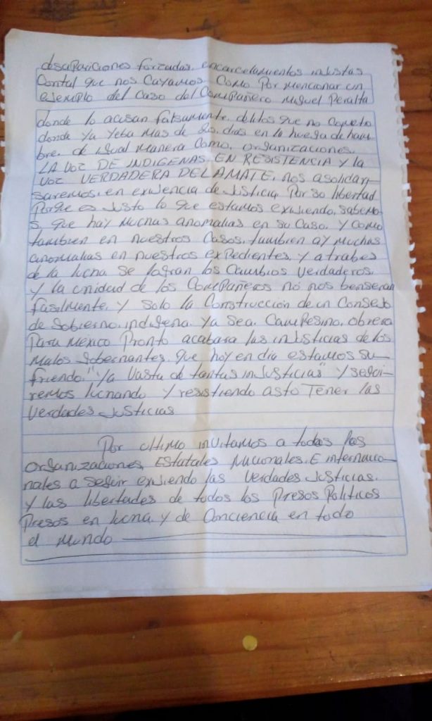 Injustice reigns throughout the world because of the bad governments. They have caused so much pain and injustice toward the Mexican people. They have sought to quiet us, those of us who defend our rights as human beings; this includes defending our forests, land, water, culture and our languages. As a result, many compañerxs have been shot, forcefully disappeared, and unjustly incarcerated as a means to silence us. An example is the case of the compañero Miguel Peralta who was falsely accused of crimes that he did not commit. He has been on a hunger strike for more than 20 days.