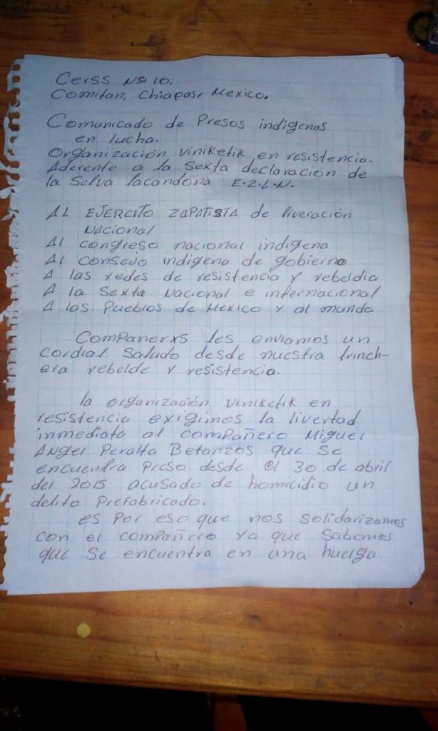 Two statements from Indigenous prisoners in struggle in Chiapas expressing their solidarity with Miguel Peralta. Miguel Peralta has been on hunger strike since September 19 in prison in Cuicatlán, Oaxaca awaiting the verdict in his case.