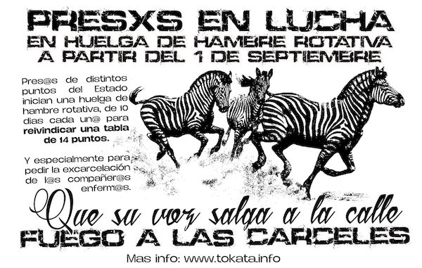 A group of incarcerated people in different prisons in the Spanish State have been carrying out rotating hunger strikes since September 1. They are calling for the release of critically ill people, the end of “indefinite” and politically concealed life imprisonment and the rest of the points in the list of demands. This strike is the fifth in two years and is the first rotating strike in which each prisoner is participating in a 10 day hunger strike. After the 10 days the next person starts their strike. The schedule has been organized in the street by support groups as requested by the prisoners. The strikes began on September 1 and the end of the protests is still unknown as people are still joining the rotating strikes.