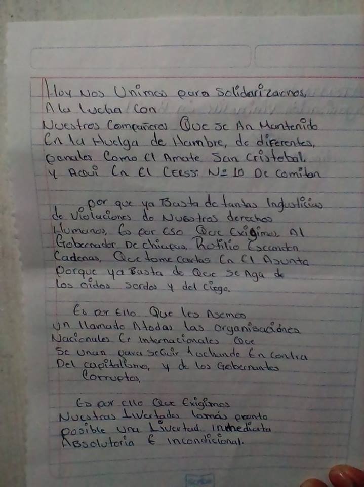 Today, we join in solidarity with the struggle of our compañeros who have been on hunger strike in the different prisons of El Amate, San Cristóbal and here in CERSS No. 10 of Comitán.